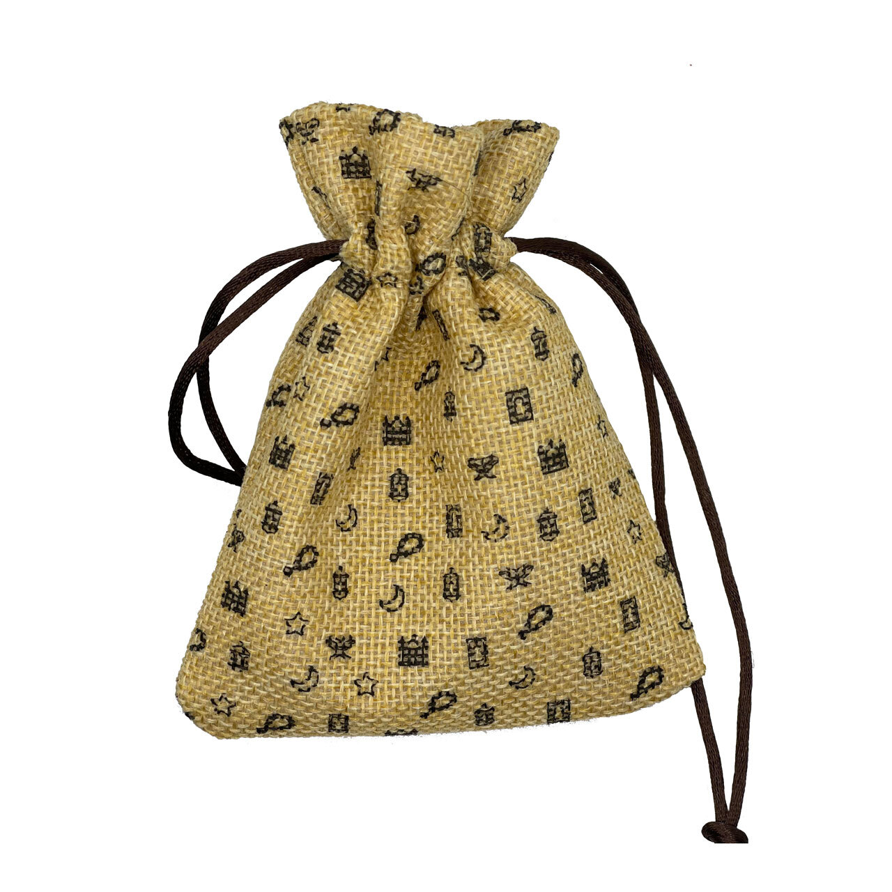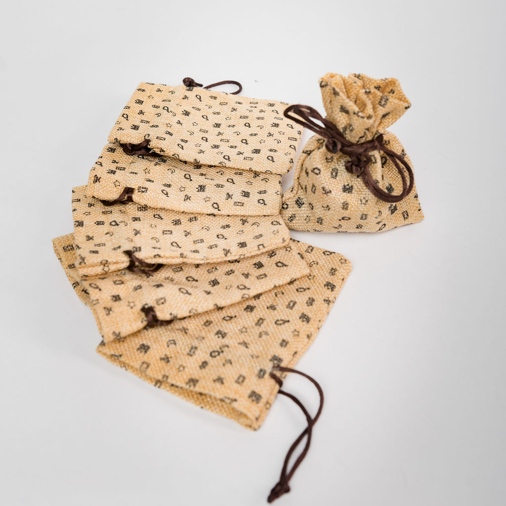 Burlap drawstring mini favour /sweet bag.with printed symbols: mosque, prayer mat, book stand, prayer beads, star, moon and a lantern. Mini bags are ideal for sweets and Eid money.This bag is part of 'Bling on Eid' collection.