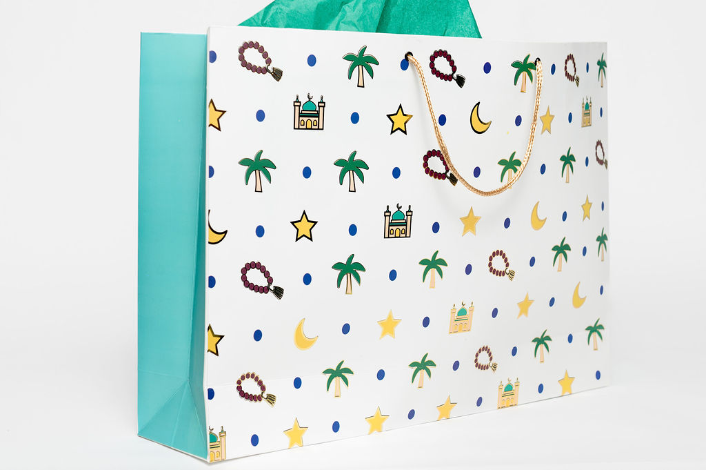 This cute gift bag is from our popular design 'bling on Eid'. It has little emojis of the mosque, prayer beads, palm tree, moon and star with gold foiling. Make your little one's day special and personalised, present your gifts in this 'bling on deen' gift bag.